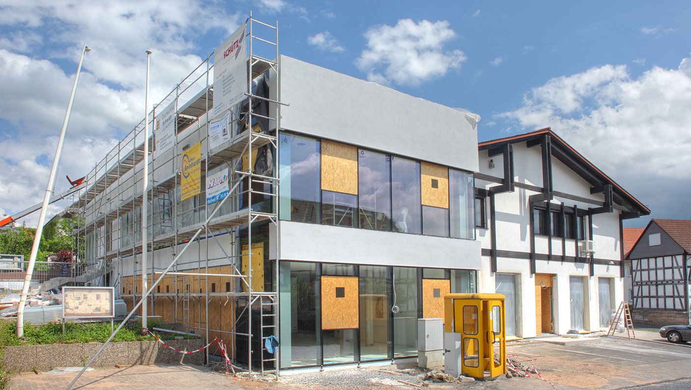 Ausstellungshalle, flügelgeglättete Betonbodenplatte als Flächenheizung, Betonsockel, Stahlhalle mit Sandwichelementen
